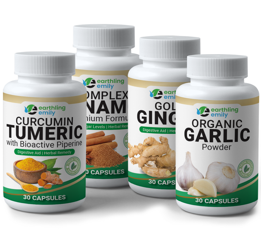 Welcome to Earthling Emily’s collection of premium supplements, meticulously crafted to support your holistic well-being. Our Earthling Emily branded supplements feature an array of organic treasures, including Garlic, Ginger, Cinnamon, Curcumin Turmeric, and more. With a focus on purity and potency, each supplement is thoughtfully formulated to harness the natural power of these exceptional ingredients. Elevate your wellness routine and nourish your body with our high-quality Earthling Emily supplements. Embrace the gifts of nature and unlock your true vitality today.