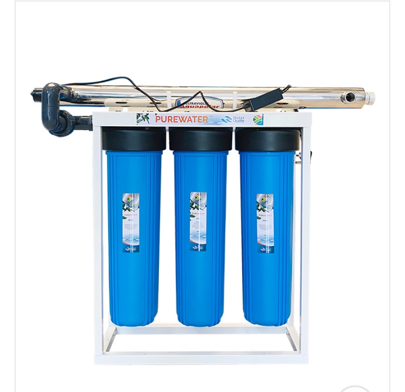 The Whole House Water Filtration System is designed with a three-stage water filtration system that consists of 2x 20″ 1 and 5 microns Big Blue Polypropylene Sediment Removal filters, 1x 20″ Big Blue Activated Carbon Block filter, and an ultraviolet disinfection system.